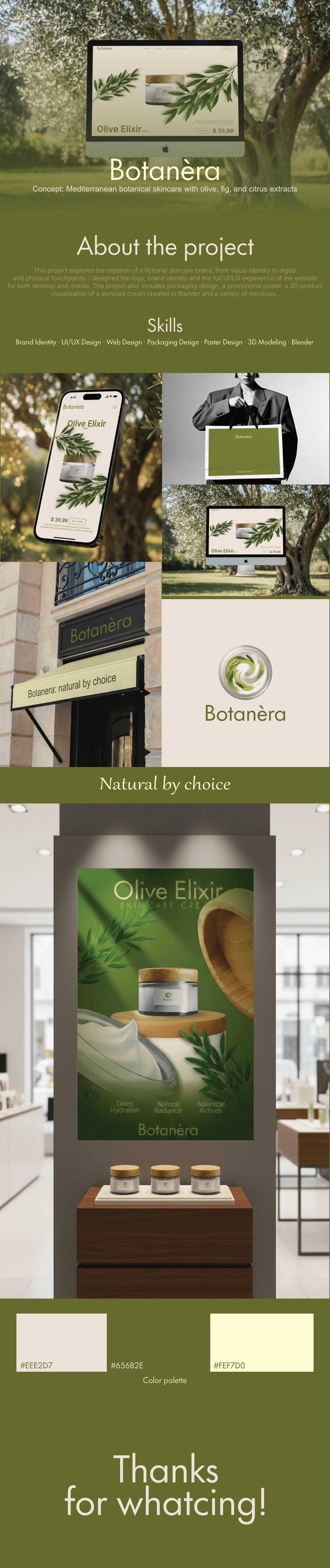 A conceptual beauty and skincare brand inspired by Mediterranean botanicals. The project includes logo design, visual identity, packaging, posters, and realistic mockups, blending natural elegance with contemporary aesthetics.