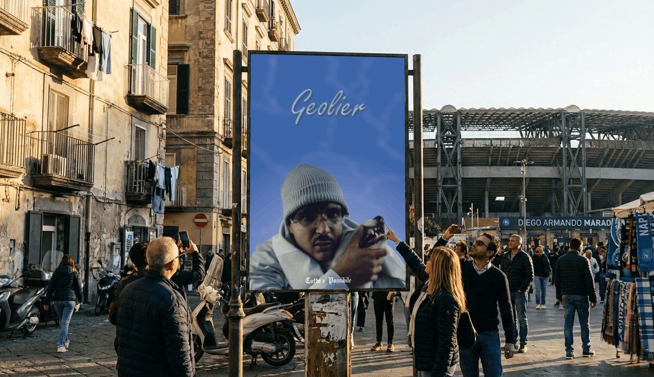 This project celebrates the Neapolitan rap scene through a minimalist poster design of Geolier. The visual is showcased via a realistic urban mockup set in the heart of Naples, featuring the iconic Diego Armando Maradona Stadium in the background. The design balances a bold blue palette with raw street photography, symbolizing the deep connection between the artist and his city.